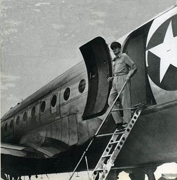 厚木飛行場に到着したマッカーサー 「機は飛行場にすべり込み、マッカーサーはコーン・パイプを口にくわえて、機から降り立った。彼はちょっと立ちどまって、あたりを見回した。空は青く輝き、羊毛のようなちぎれ雲が点々と浮んでいた。飛行場に照りつける日ざしでコンクリートの滑走路とエプロン(格納庫前の舗装場所)にはかげろうがゆらいでいた。飛行場には他に数機の米機があったが、そこらにいるわずかな数の武装した連合軍兵士は恐ろしく心細い兵力に見えた」
